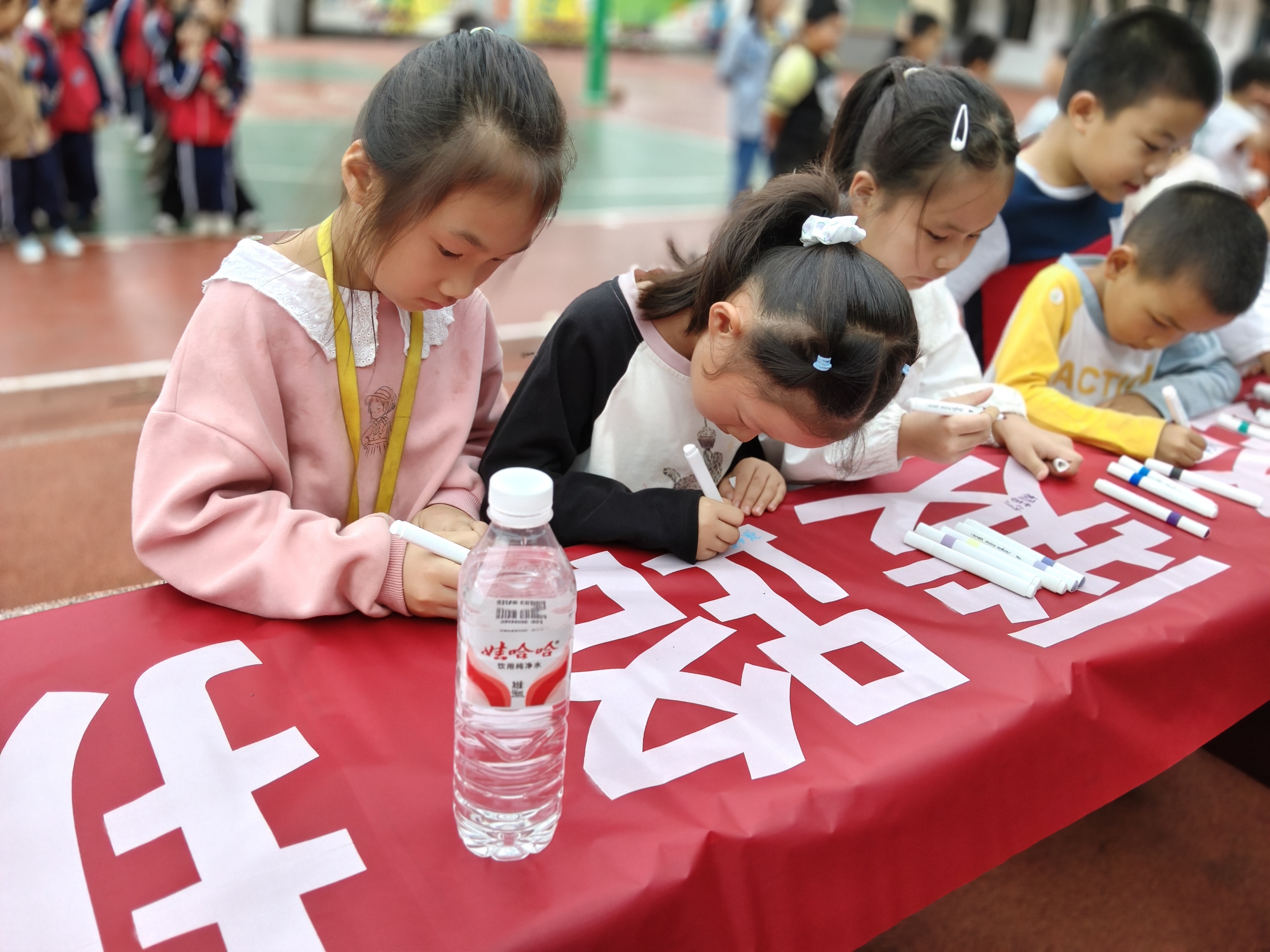 在主题图片展区域,同学们在志愿者引导下有序参观,通过一幅幅真实场景图片,直观感受到破坏铁路设施、违规靠近轨道的风险,进一步了解安全防护要点。师生百人签名环节,同学们排队在主题横幅上郑重签下自己的名字,一笔一划间满是守护铁路安全的承诺,现场氛围庄重而热烈。