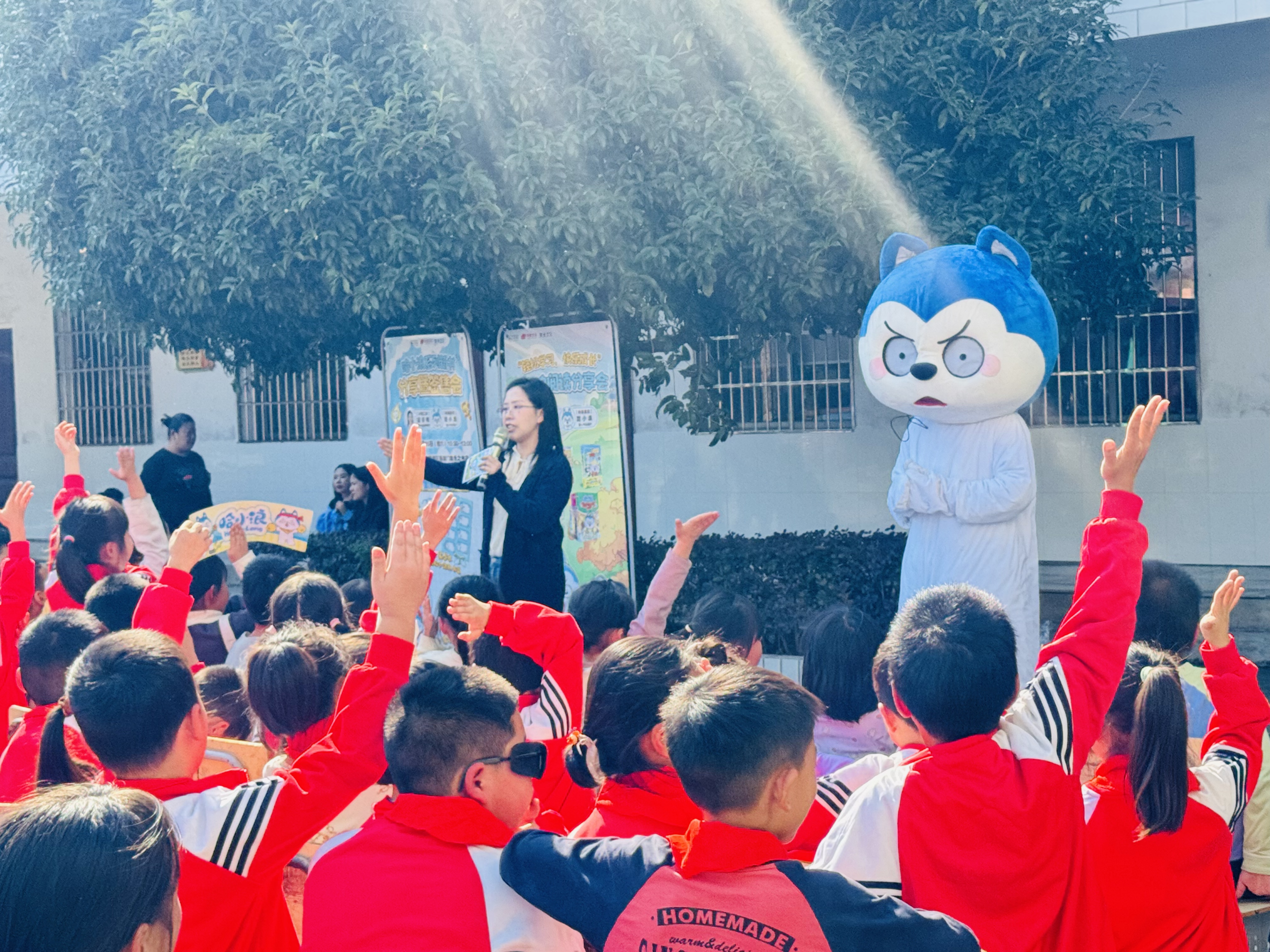 在活动现场,“哈小浪”IP品牌推荐官赵庆梅带领孩子走进“哈小浪”的创作世界,讲述了“哈小浪”IP诞生的故事,并分享创作花絮。趣味问答与有奖竞猜将现场氛围推向高潮。“哈小浪的伙伴有几位?”“书中哪个探险故事最让你印象深刻?”抢答声此起彼伏,孩子们收获了精美的哈小浪主题文创礼品同时,更激发了阅读的兴趣。活动中,憨态可掬的“哈小浪”玩偶还不时地穿梭在学生中间,时而摆出搞怪姿势,时而与大家击掌拥抱,每一次互动都引发阵阵欢笑。活动最后,孩子们纷纷与“哈小浪”合影,并开展书本签名。