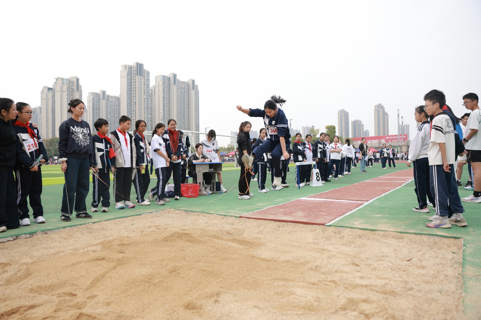 田赛区域同样热火朝天,上演着力量与技巧的双重对决。跳远沙坑前,运动员助跑、踏跳、腾空、落地,一系列动作行云流水,沙坑中深浅不一的脚印,见证着每一次超越自我的尝试;实心球、垒球赛场,选手们凝神聚力、奋力投掷,球体划出的优美抛物线,承载着少年们的力量与期盼;低年级投沙包项目中,小选手们认真投掷的模样,尽显童真与执着。与此同时,个人跳绳与立定跳远赛场战况激烈,选手们全神贯注、力求完美,每一次起跳、每一次挥绳都凝聚着专注与努力,生动诠释了 “悦享运动” 的主题内涵与积极向上的精神风貌。