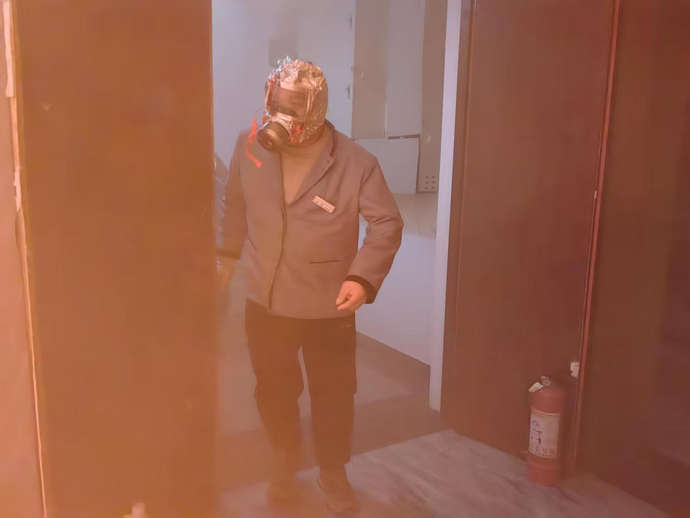 活动结束后,模拟了一起酒店六楼办公室发生火情的场景。演练指令下达后,通过对讲系统等即刻发布疏散指令。工作人员在现场有序引导客人用逃生面罩、湿毛巾捂住口鼻,沿安全通道低姿、快速撤离至指定安全区域,整个过程组织严密、响应迅速。