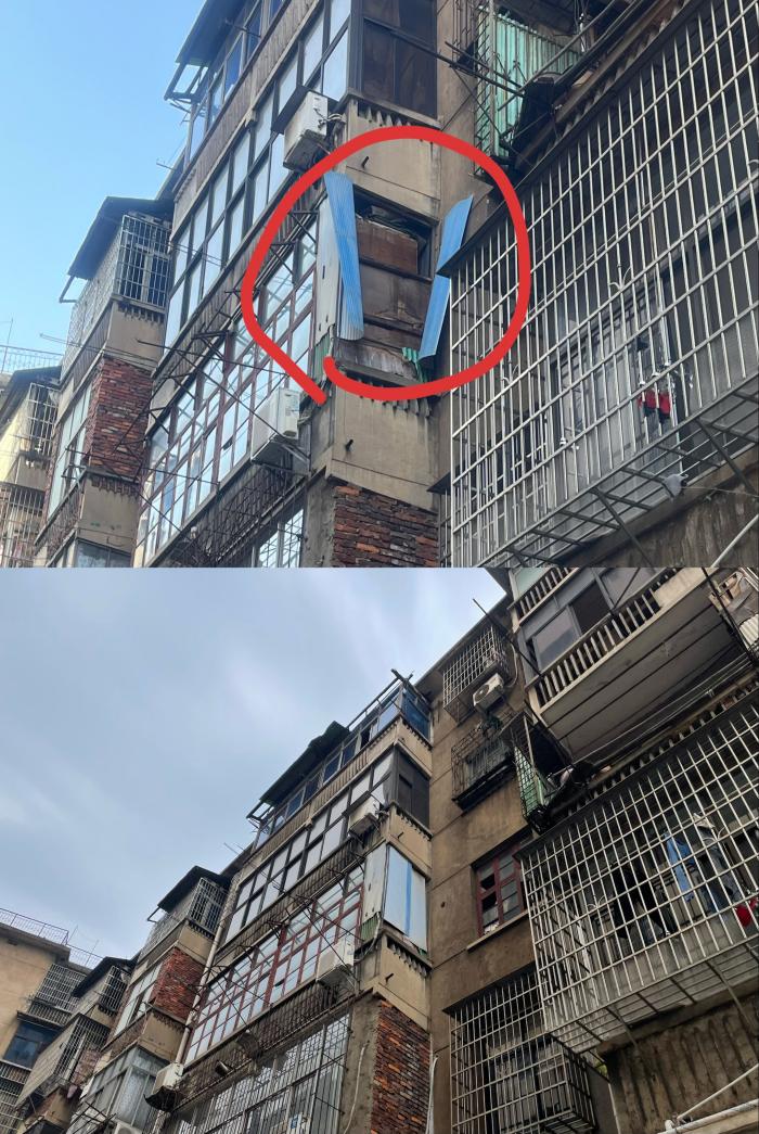 为筑牢辖区安全防线,古梁巷社区始终将日常安全巡查作为重点工作,组织社区工作人员分片包干、地毯式排查辖区内居民楼、沿街商铺等重点区域,聚焦用电用气安全、消防通道堵塞、违规搭建等常见安全隐患,做到“早发现、早提醒、早处置”。在近期一次日常巡查中,社区工作人员发现化工局宿舍1栋1单元5楼住户窗外违规搭建的简易遮雨棚支撑架存在坠落风险,楼下就是住户的生活区,日常进进出出,万一横木掉落下来后果不堪设想,且3楼住户搭建的简易围挡也摇摇欲坠,只剩一半的铁丝固定,稍微刮风就被吹得随风摆动,十分危险。社区工作人员当即通过电话、微信等方式联系户主。