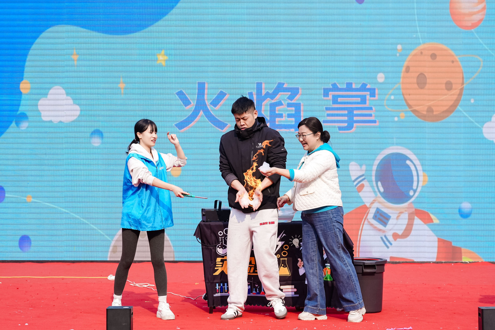 随后上演的科学实验秀将活动推向高潮。一场“泡泡秀”如梦似幻,五彩斑斓的巨型泡泡在阳光下折射出绚丽光芒,营造出宛如童话世界的视觉奇观;“火焰掌”实验中,老师徒手点燃可燃气体,火焰在掌心跃动却毫发无伤,生动揭示了燃烧与隔热的科学原理,引发阵阵惊呼;经典的“马德堡半球实验”通过现场互动,让同学们亲身感受到大气压力的巨大力量;而“空气炮”演示则让无形的气流变得“看得见、摸得着”,一阵阵气浪击倒纸杯塔,引发现场阵阵欢呼。这些兼具趣味性与科学性的互动实验,让学生们在沉浸式体验中感受科学的魅力,真正实现了“玩中学、学中悟”。