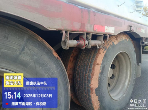 2025年12月28日,雨湖大队接志愿者反映,经开区银盖路存在渣土运输污染路面情况。执法人员迅速赶赴现场调查。经查发现,当事人刘*湘驾驶重型自卸货车,从中联重科某点位运输渣土至船形山消纳场,在出场前未严格落实车轮冲洗措施,导致车辆带泥行驶,污染路面面积约20平方米。雨湖大队依法对当事人作出罚款人民币2000元的行政处罚。