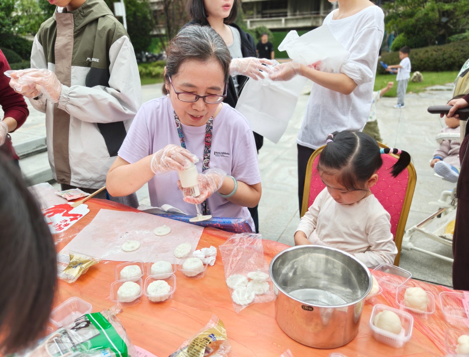 除了热闹的游戏,活动现场还设置了两个充满文化韵味的体验区。在“红色爱国主题团扇拓印”区,专业老师耐心指导,居民们用手中的工具,将国旗、天安门等经典图案一点点拓印在素雅的团扇上。一把把亲手制作的团扇,不仅是精美的工艺品,更承载着大家对祖国最深切的祝福。而在“手工月饼制作”区,亲子家庭齐上阵。揉面、包馅、压模……在社工和志愿者的帮助下,一个个印着吉祥花纹、饱含着甜蜜的月饼在孩子们的小手中诞生。家长李阿姨笑着说:“和孩子一起做月饼,感觉这个中秋的‘团圆味’特别浓!这比买来的月饼有意义多了。”