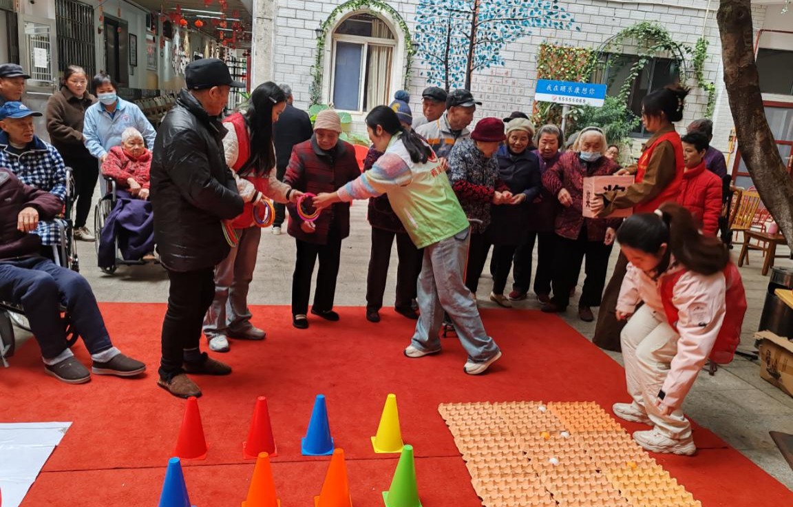 文艺表演结束后,热闹非凡的趣味运动环节接踵而至。社工与志愿者结合老人们的身体状况和兴趣爱好,精心设计了套圈、丢沙包、丢乒乓球等安全有趣的项目。老人们精神抖擞、踊跃参与,或精准投掷,或细心操作,现场欢声笑语不断。志愿者们在旁贴心指导、加油鼓劲,整个养老公寓洋溢着欢乐祥和的家庭氛围。