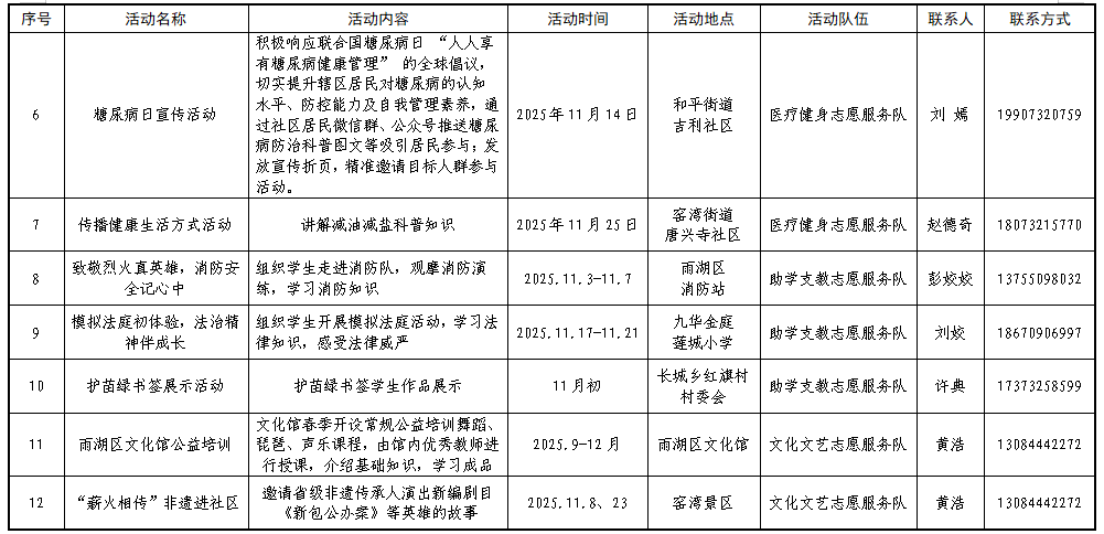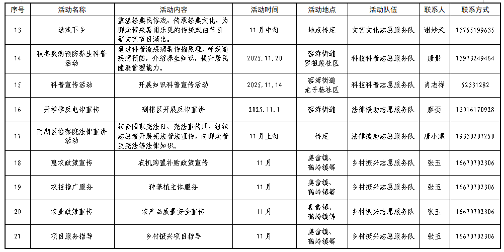 为倡导时代新风正气,弘扬中华传统美德,传播志愿服务理念,雨湖区新时代文明实践中心组织各专业志愿服务队、各新时代文明实践所(站),因地制宜开展群众喜闻乐见的文明实践活动,切实提高我区居民群众的思想觉悟、道德水准、文明素养、法治观念,更好地推动居民群众全面发展、全面进步。现将雨湖区新时代文明实践中心(所、站)11月新时代文明实践志愿服务活动安排公示如下: