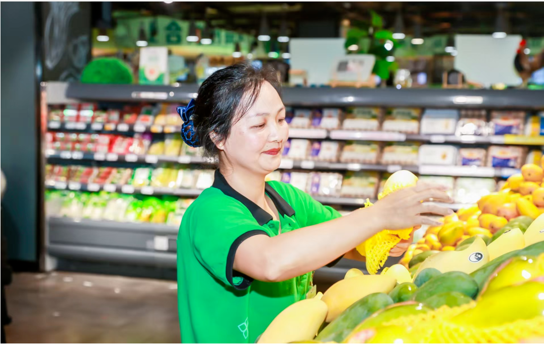 在贵阳市观山湖区合力超市(美的林城时代店),超市员工正在用心陈列新鲜瓜果,进行营业前的准备工作。