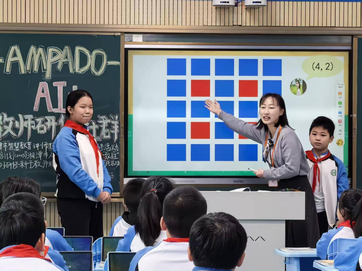 本次研修聚焦“教学评一致性”主题,深度融合AI课堂观察技术,推动课堂教学从经验型向数据驱动型转变。在将军渡小学分会场,尹娟老师执教《用数对确定位置》一课,以精巧的教学设计与活跃的师生互动,展现了智慧课堂的创新实践。王丹老师作为引导者,组织完成课前说课、课中观察与课后数据分析的全流程研修,构建“人机协同、数据赋能”的教研新范式。