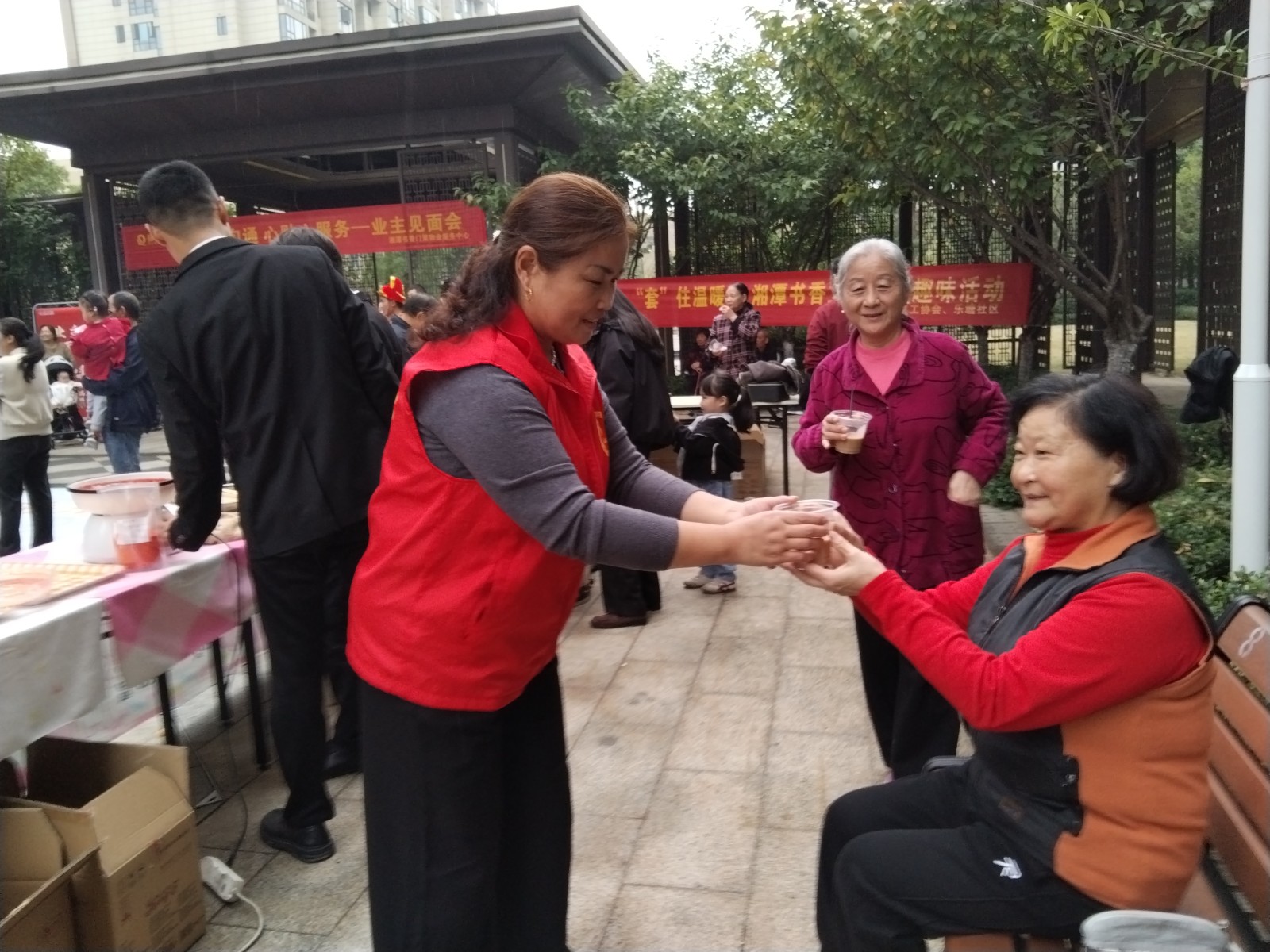 志愿者给现场老人送奶茶。
