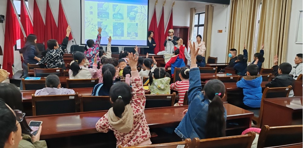 活动伊始,非遗讲师借助精心制作的PPT,开启了漆扇文化之旅。PPT中既有漆扇从古代宫廷工艺品到民间日用品的演变故事,展示了唐宋时期漆扇作为文人雅士随身之物的雅致,也呈现了现代漆扇在图案设计上的创新案例。讲师结合图片生动讲解漆料调制、图案勾勒等非遗技艺要点,还穿插了“古人如何给扇子上漆”等趣味问答,小朋友们踊跃举手,现场气氛热烈。