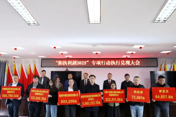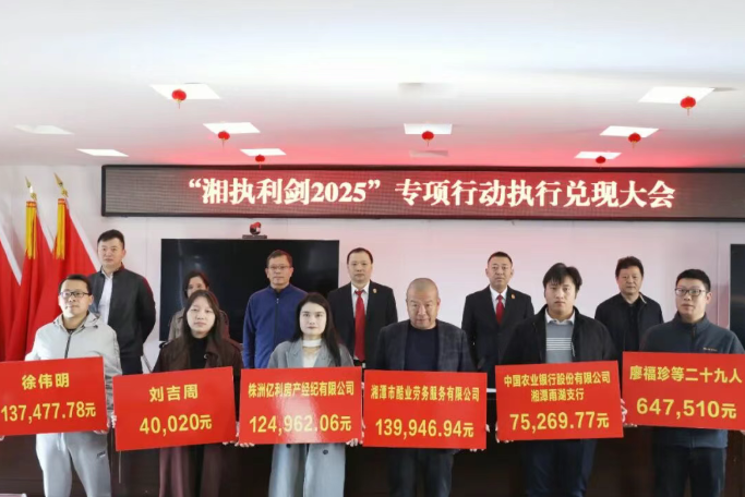 雨湖融媒12月1日讯(通讯员 陈佳祥)近日,湘潭市雨湖区人民法院召开“湘执利剑2025”专项行动执行兑现大会,部分人大代表、政协委员及媒体受邀全程见证,现场为13起案件的申请执行人集中发放执行案款841万元。