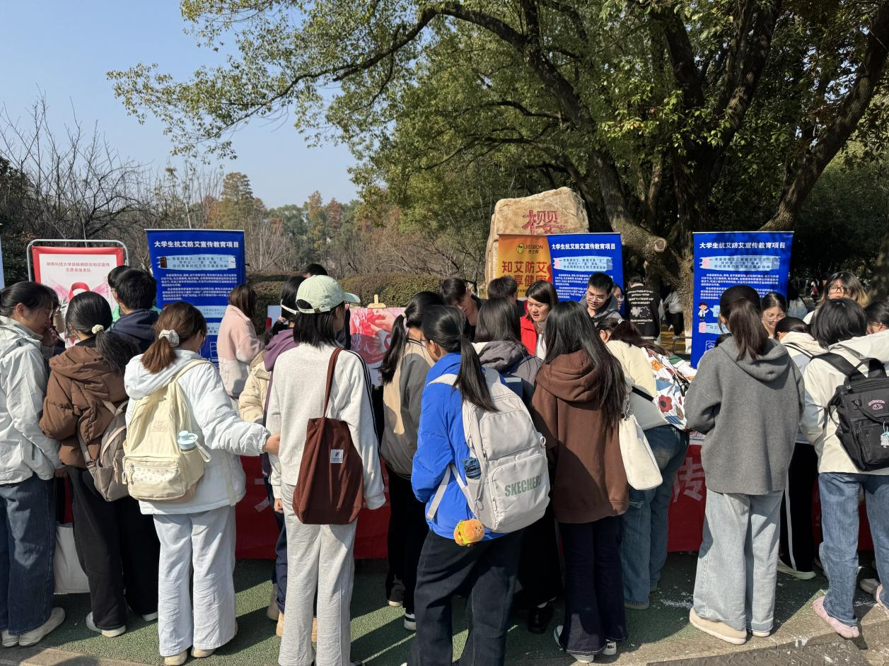 在湖南科技大学明湖广场活动现场,展架上“消除艾梅乙母婴传播,孕育健康未来”的标语,引起往来高校学子瞩目;周边的装饰角,悬挂着世界艾滋病日主题“社会共治,守正创新,终结艾滋”的宣传横幅、宣传海报;宣传展台上摆起了琳琅满目的宣传折页、健康支持工具。现场医护人员带领来往的师生认识艾滋病、梅毒和乙肝三病,了解“艾梅乙”母婴传播方式,学习预防措施和国家关怀支持政策,引导学子树立“健康第一责任人”的观念。