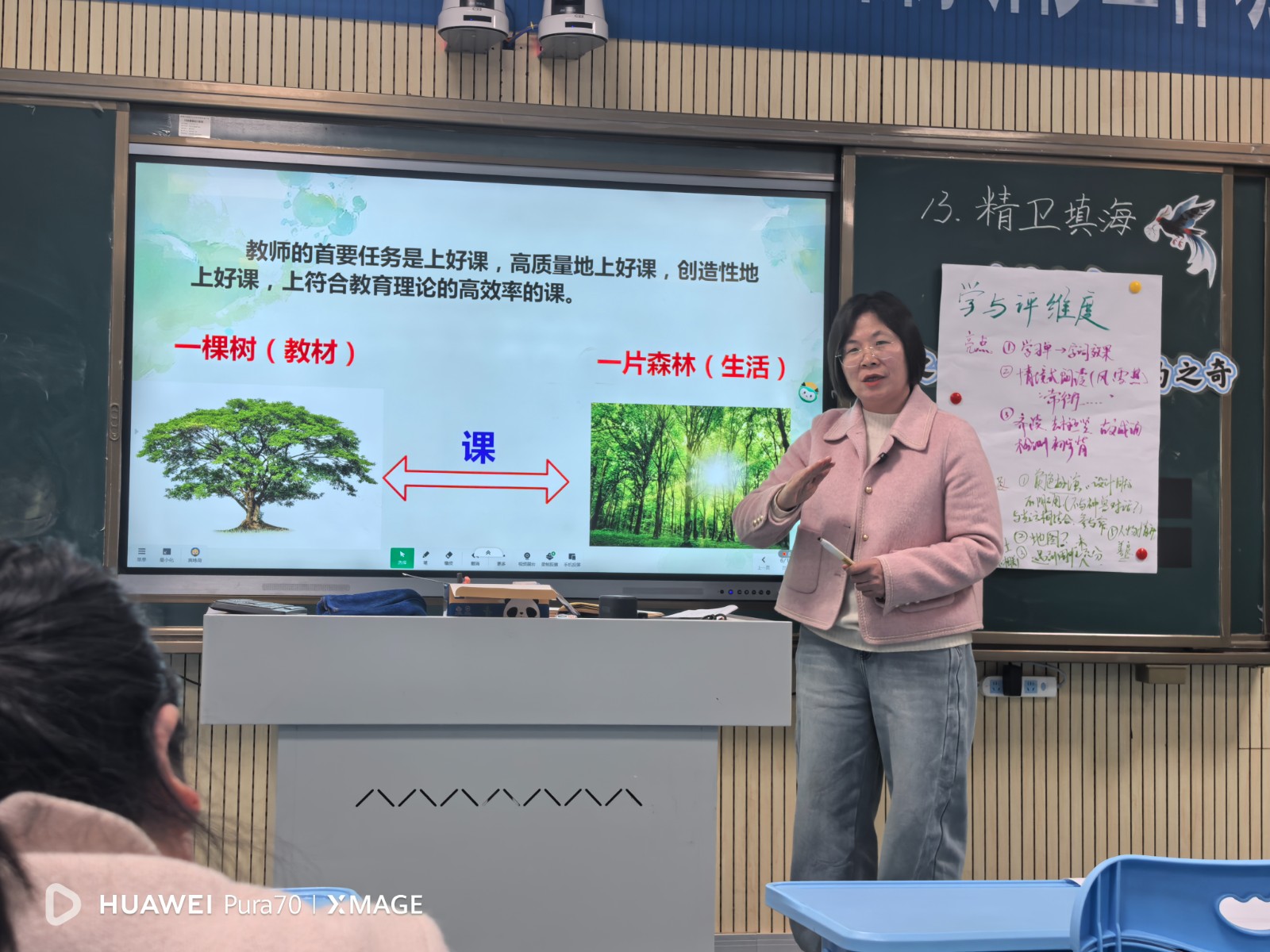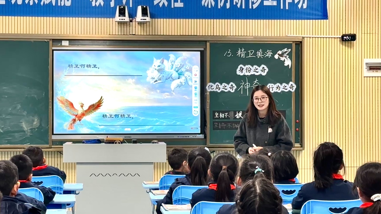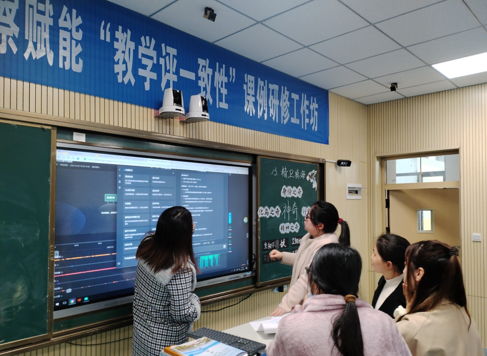 工作坊以“课前说课定位观察点—课中AI工具采集数据—课后实证研讨”形成闭环研修流程。活动伊始,王丹老师发布活动主题,通过案例解析让 “教学评一致性” 目标具象化,并带领学员聚焦课堂观察点,将研修重点从 “泛泛听课” 转向 “精准研课”。在课例展示环节,刘果老师执教《精卫填海》一课,运用AI课堂观察工具实时采集师生互动、教学行为等数据,为课后基于证据的精准研讨提供支撑。