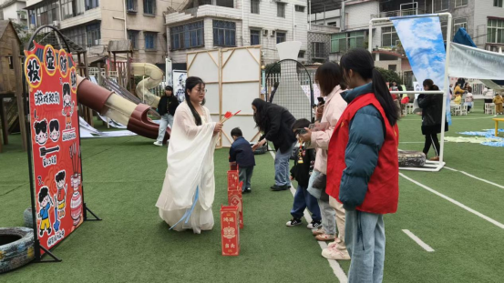 汉服体验区里,小朋友们换上款式多样的汉服,衣袂飘飘,在家长的陪伴下拍照留念,沉浸式体验传统服饰之美;投壶区中,孩子们模仿古代礼仪,手持箭矢瞄准壶口投掷,家长在一旁耐心指导,现场欢呼声、喝彩声此起彼伏,在趣味互动中感受古代民俗游戏的乐趣。剪纸区和京剧变脸表演更是亮点十足,剪纸老师手把手教小朋友们裁剪简单的花草、动物图案,孩子们认真专注,在指尖流转间领略剪纸艺术的灵动;京剧变脸表演环节,演员们一转身、一抬手间,脸谱快速变换,精湛技艺引得现场亲子家庭阵阵惊呼,孩子们近距离感受国粹艺术的神奇,加深对传统文化的敬畏与热爱。