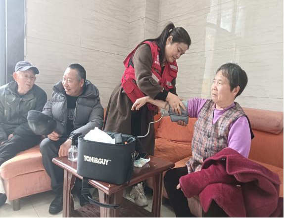志愿者为居民测量血压。