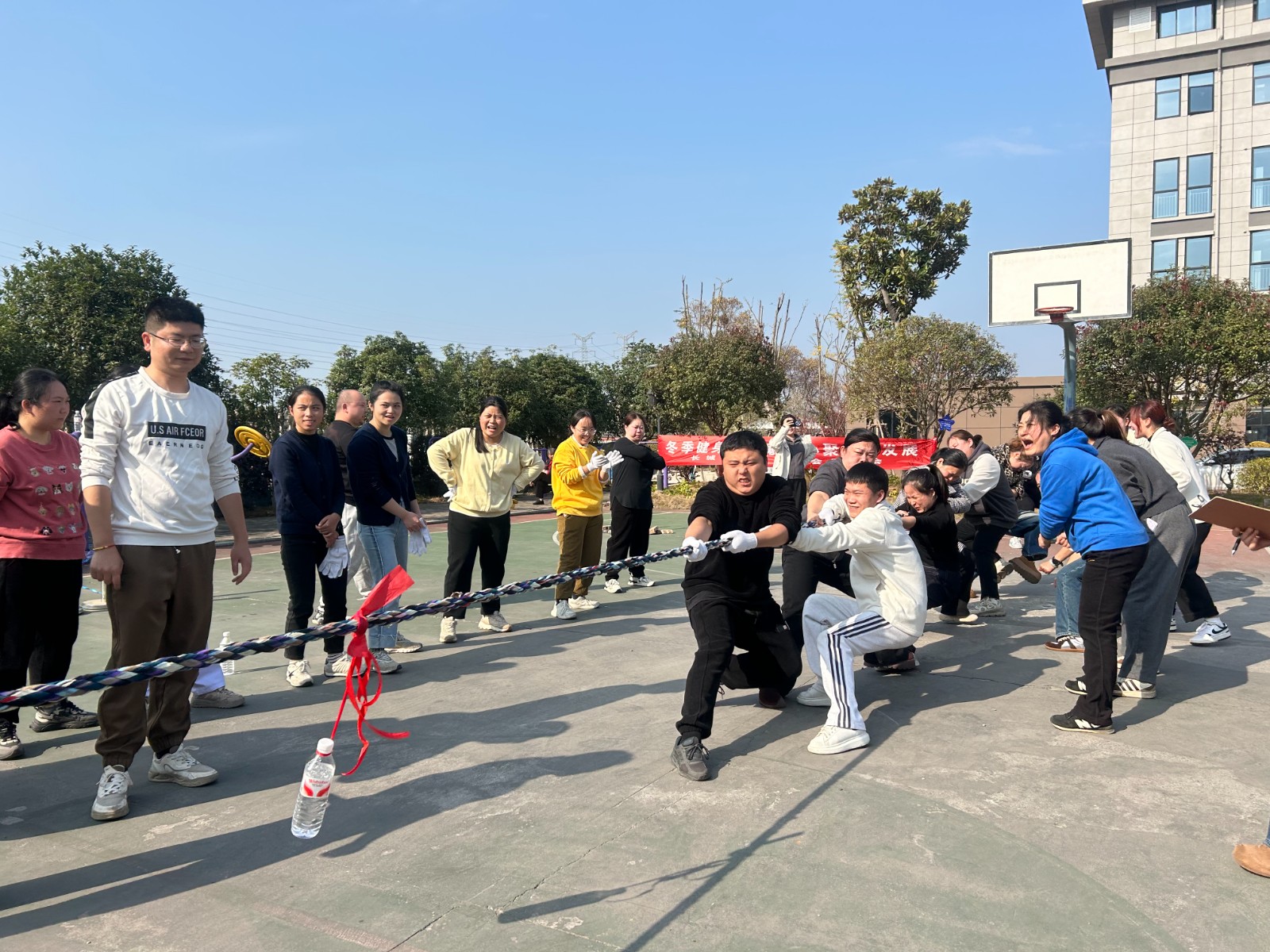随后,活动正式启动。本次工会活动设置了毛毛虫竞走、快乐传递、单人跳绳、拔河四大趣味项目,兼具竞技性与协作性,既考验个人体能,更注重团队配合。毛毛虫竞走项目中,队员默契同步,即便气球掉落也迅速调整、奋起直追;快乐传递项目中,队员双手相连,通过灵活的身体动作接力传递呼啦圈;拔河比赛项目中,队员齐心协力,赛场氛围热烈而震撼。活动最后,全体职工合影留念,定格下这一充满欢乐与温情的时刻。