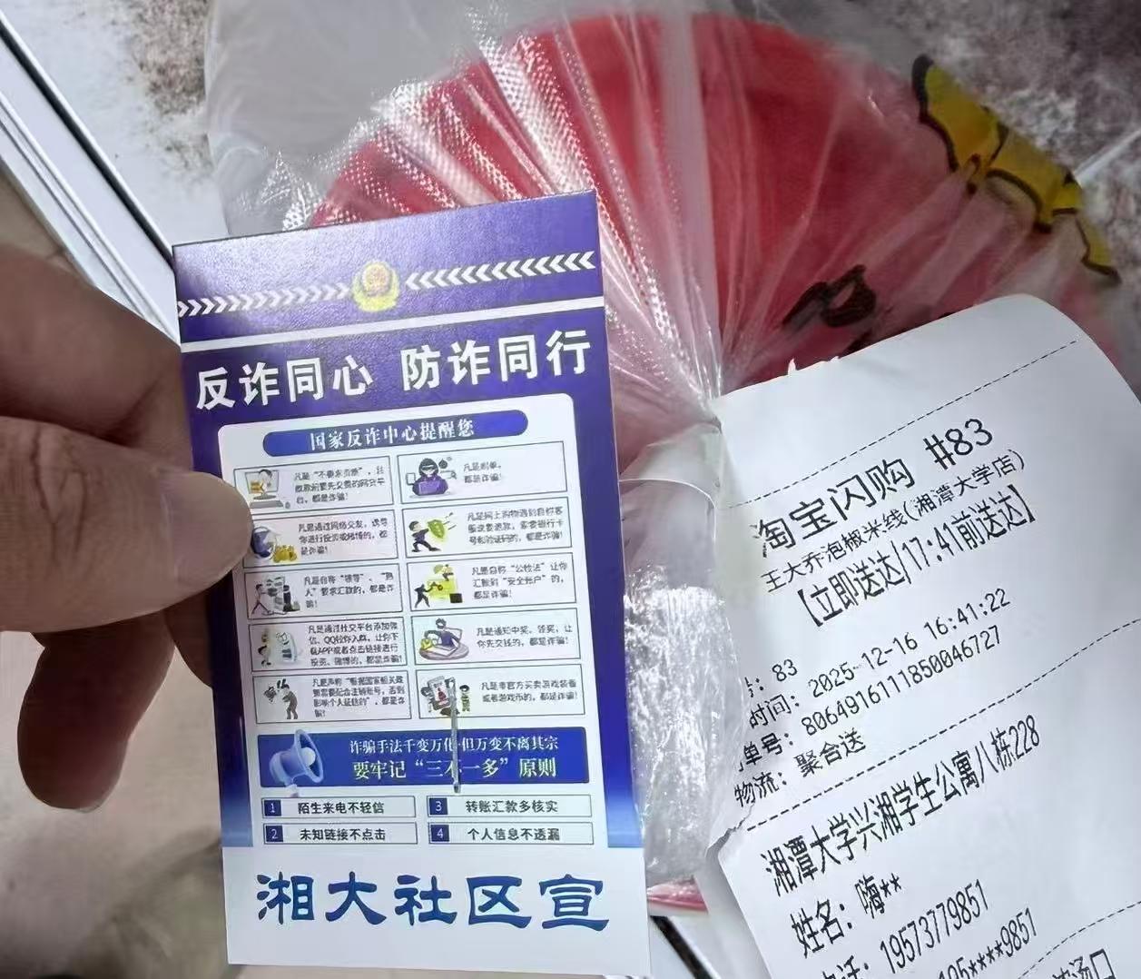 雨湖融媒12月26日讯(通讯员 王承春 杨鹃语)为进一步筑牢高校反诈安全防线,提升青年学生识诈、防诈、拒诈能力,近日,湘大社区携手湘潭大学创新构建校社企三方联动治理模式,有机整合高校智力资源、社区资源与外卖渠道,将反诈宣传工作从过去的“单向管理”升级为“多元共治”。