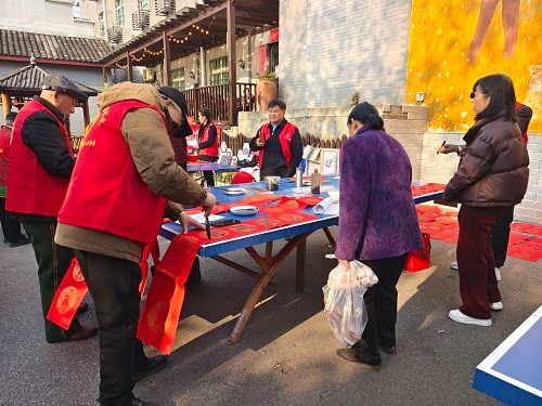 写春联送福区域更是墨香四溢,社区“银发人才工作站”特邀请了湘潭市老年书画家协会书法家现场为居民免费写福字、春联。书法家们挥毫泼墨,将新春的美好祝福融入一撇一捺之中。“平安如意千日好,人顺家和万事兴”“春风送喜财入户,岁月更新福满门”,一副副充满年味与祝福的春联、一个个遒劲有力的“福”字跃然纸上,居民们捧着心仪的春联,脸上洋溢着幸福的笑容。现场还有免费磨刀服务、绿丰农场也开展了农产品展销活动。“在家门口就能享受到这么多贴心服务,社区真是把实事办到了我们心坎上!”活动现场,居民们纷纷为社区的便民举措点赞。