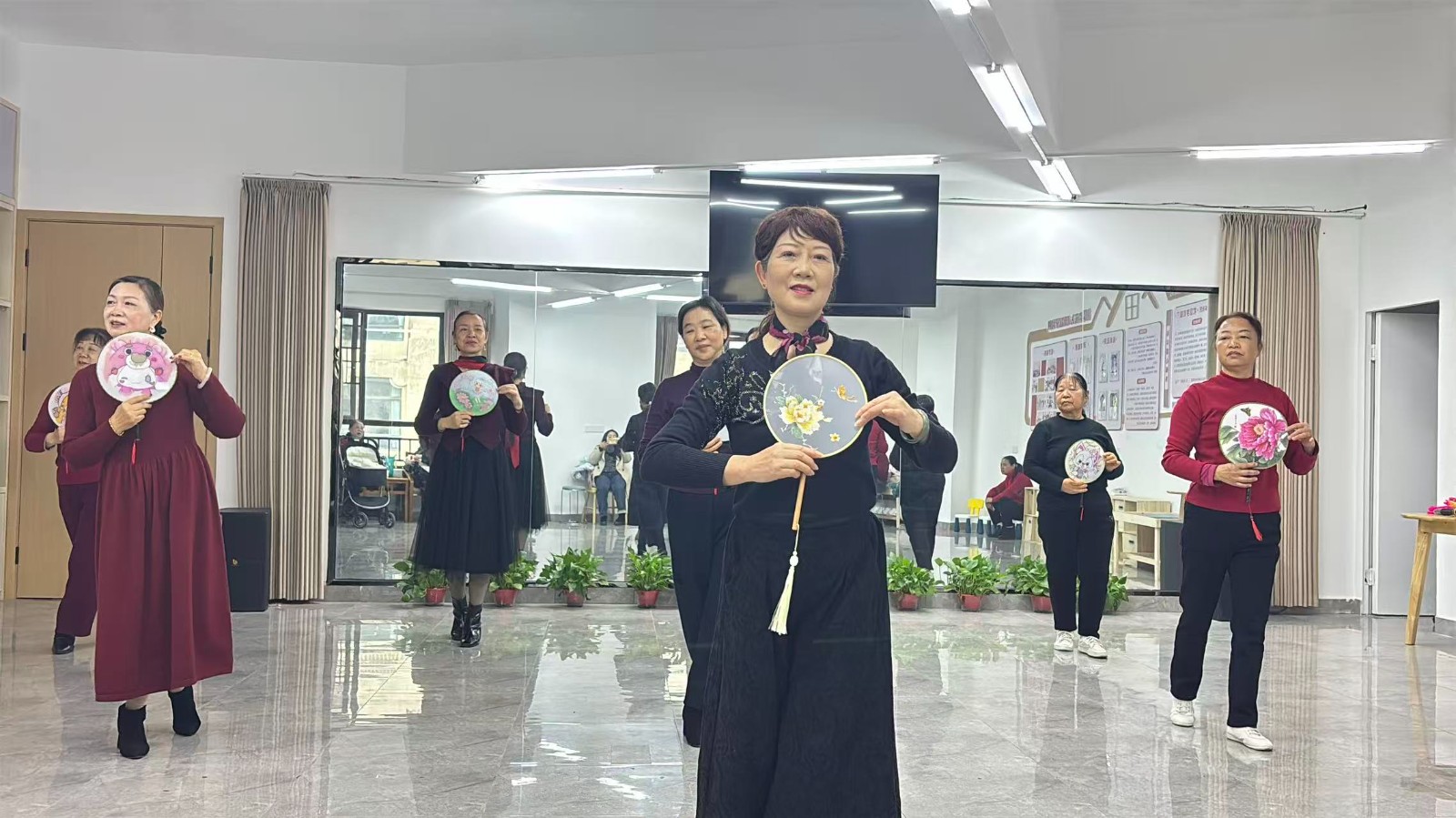 活动在开场舞《好运连连》中拉开序幕。舞蹈队队员与社区老年居民手持彩扇,通过“波浪式”队形变换展现流动美感;团扇舞《太湖美》融合江南水乡元素,队员们手持团扇轻移莲步,如诗如画;双人舞《忧伤的华尔兹》以默契配合演绎经典舞步,引发观众们阵阵掌声。在活动特别设置的自由表演环节中,2-8人组合自发登台,既有传统秧歌、太极扇表演,也有改编版《最炫民族风》等流行曲目,展现老年人创新活力。现场观众纷纷举起手机记录精彩瞬间。