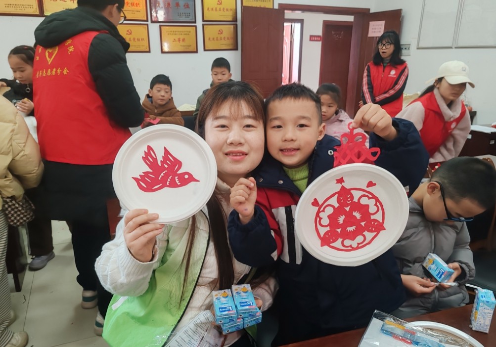 活动现场气氛热烈,社工和志愿者提前进行了精心布置。红色宣纸、安全剪刀、剪纸范本以及甲骨文灯谜展板整齐摆放,立刻吸引了孩子们的目光。在剪纸环节中,志愿者老师先用生动的语言追溯了剪纸艺术的千年历史,讲述了其从汉代雏形到明清鼎盛的发展过程,以及在节庆装饰中的作用和吉祥图案的寓意,这深深吸引了家长和孩子的注意力。随后,老师详细演示了折纸和握剪的技巧,强调了“慢剪稳推、线条连贯”的要点,并亲自手把手进行指导。孩子们专注创作,家长默契配合,亲子协作的氛围十分浓厚。一张张红纸在剪裁下发生了蜕变,“福”字、窗花、小动物等作品纷纷诞生。小朋友乐乐举着自己的作品,满脸自豪地说:“我要把‘福’字贴在家里最显眼的地方,让全家都能感受到福气!”