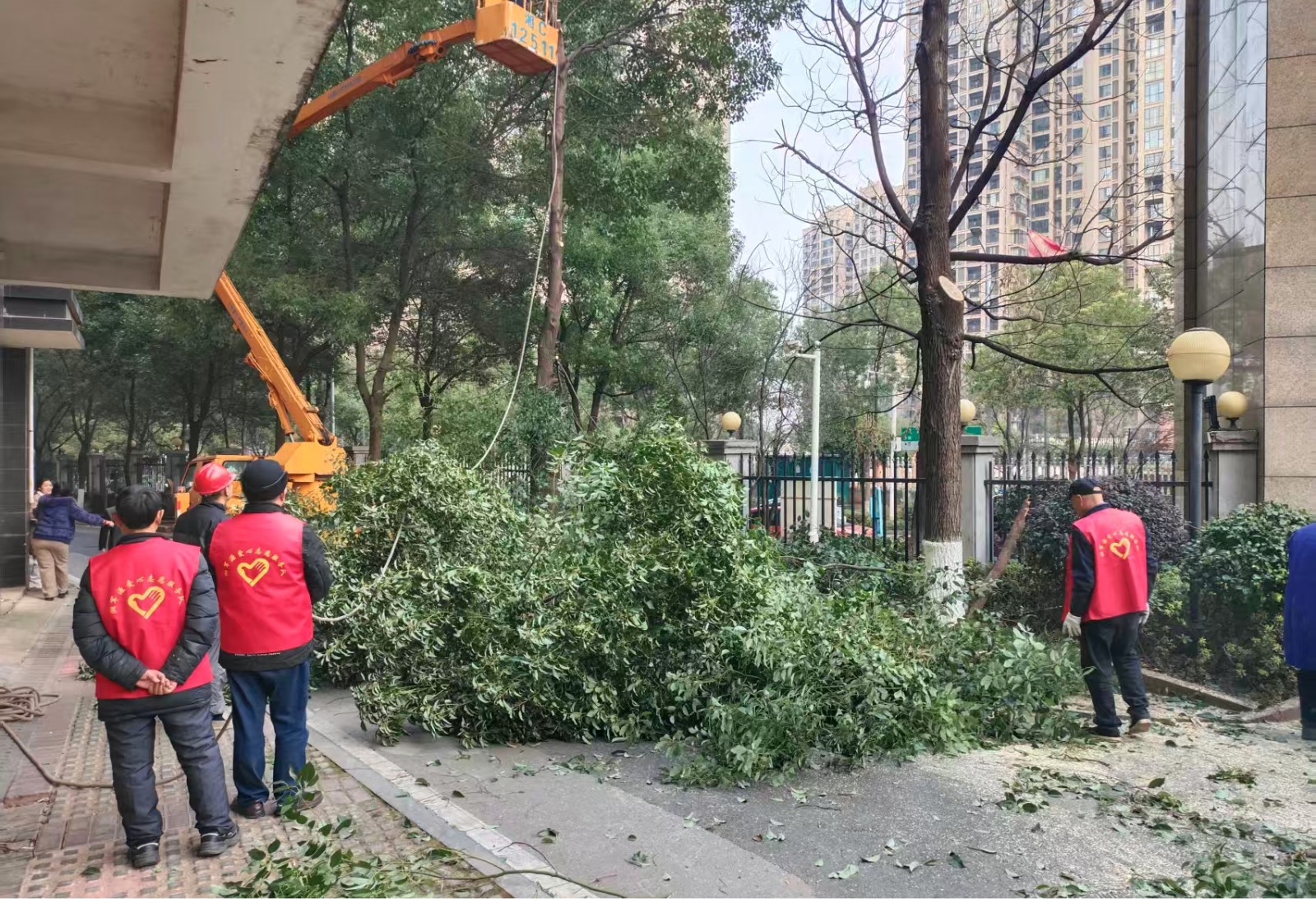 接到社区报告后,湘潭市风景园林中心急民之所急,迅速调配专业绿化工及高空作业车抵达现场。湘军源业委会成员与湘军源爱心志愿服务队队员也积极参与其中,协助工作人员搬运工具、清理现场,为修剪工作提供有力支持。工作人员对倾斜树木进行了全方位“体检”,按照“一树一策”的原则展开作业:对存在严重倒伏风险的树木进行扶正加固;对枯枝、密枝进行疏剪,减轻树冠重量,降低 受风面;对已死亡或无保留价值的树木进行清理。本次行动共处理隐患树木50余株,不仅美化了小区环境,更有效避免了极端天气下可能发生的安全事故,赢得了辖区居民的一致好评。