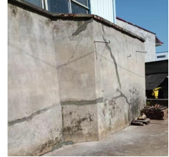 墙体出现裂缝、水泥层脱落及砖块裸露。
