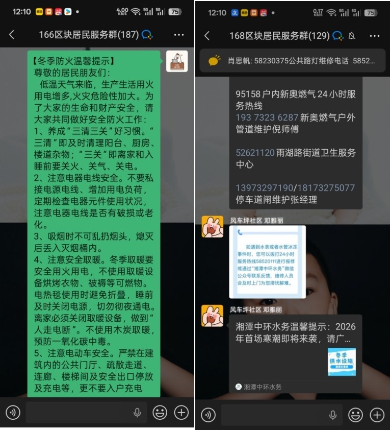 针对冰冻天气下老年群体、独居家庭等重点关爱对象,社区开展上户走访,用通俗易懂的语言讲解冬季安全常识:提醒居民使用电暖器时远离沙发、被褥等可燃物,电热毯做到“睡前开、入睡关”,避免边充电边使用电热暖水袋;手把手教老人牢记“三清三关”(清阳台、清楼道、清厨房,关电源、关火源、关燃气)安全准则。同时,为扩大宣传覆盖面,社区通过微信群精准推送冰冻天气防御提示、防火用电安全信息,在线上解答居民关于取暖设备使用、隐患排查等疑问。