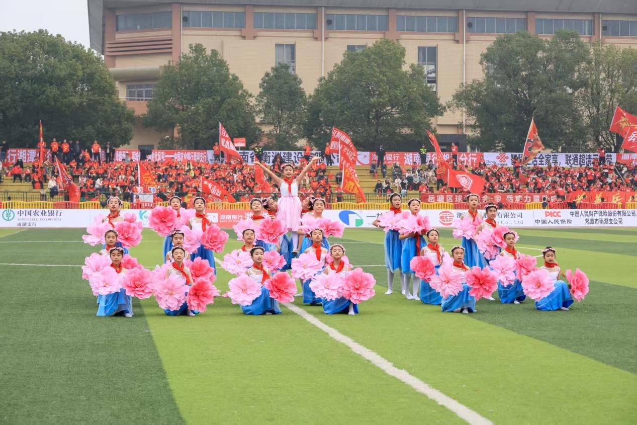 紧随其后的足球舞蹈《不一样的青春足球》,则让赛场充满了温暖与力量。表演者是湘潭湘成足球俱乐部资助五年的大凉山与维吾尔族贫困学生,孩子们身着定制球衣,眼神坚定、动作有力,将足球运动的跑、传、射等技术动作转化为富有张力的舞蹈语言。每一个跳跃、每一次配合,都展现着他们在足球陪伴下的成长与蜕变,既诠释了足球运动的拼搏精神,更彰显了各民族少年手足相亲、守望相助的深厚情谊。