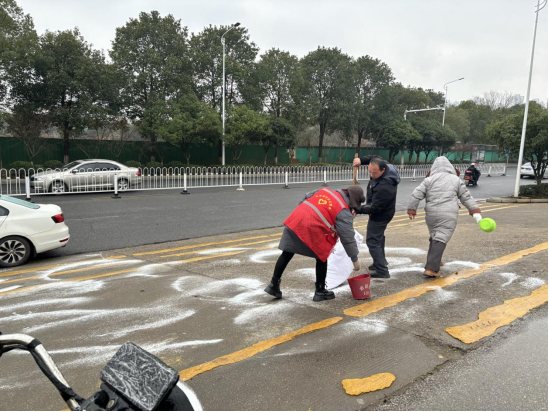 针对可能出现的道路结冰情况,社区提前部署,协调物业单位在小区内地势低洼处、主要出入口、楼道及电梯口等重点区域预撒工业盐,防止结冰湿滑。此外,社区工作人员也深入辖区人行天桥、主要路口及背街小巷开展撒盐作业,全力保障居民出行安全畅通。