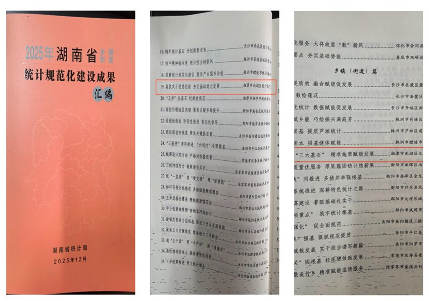 雨湖融媒1月23日讯(通讯员 刘亦鋆)近日,由湖南省统计局组织编写的《2025年湖南省乡镇街道统计规范化建设成果汇编》正式发布。该书从全省各市州、县市区统计规范化建设单位中精选了67篇经验成果,雨湖区统计局与九华街道报送的两篇经验材料成功入选,展现了我区在统计规范化建设工作中的扎实成效与创新探索。
