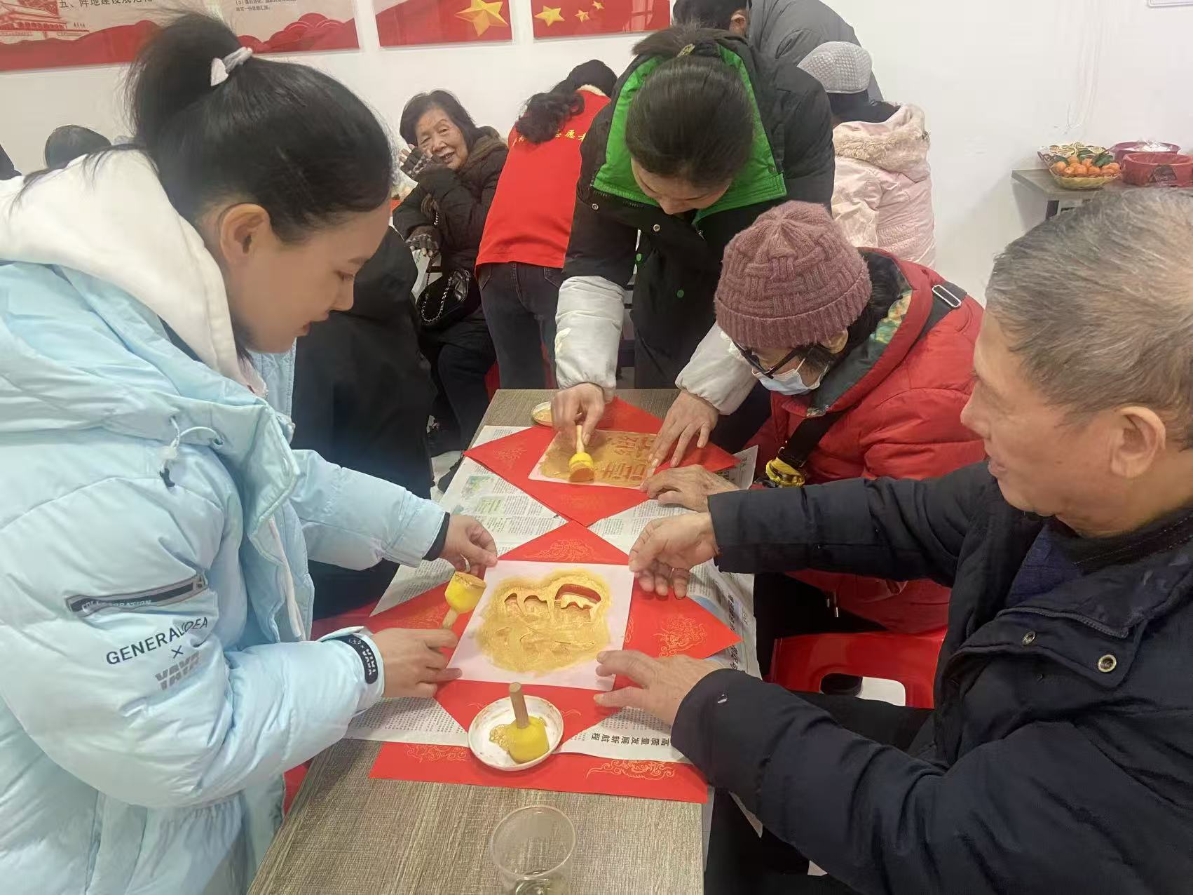 活动现场暖意融融,处处洋溢着欢声笑语。社区工作人员提前精心布置,旁边摆放着各种零食和水果,桌上整齐摆放着红纸、模具、颜料。老人们将磨具铺在红纸上,再将颜料粘在红纸上,一幅幅寓意吉祥的“福”字跃然纸上,或苍劲有力,或圆润饱满,或灵动飘逸,每一笔都饱含着对新年的美好期许。“我想要一幅楷书的福字,贴在门上很大气!”“麻烦老师帮我粘个‘平安喜乐’,送给家里的老人!”居民们有序排队,根据自己的喜好提出需求,书法老师们耐心回应,现场墨香与欢声笑语交织,热闹非凡。