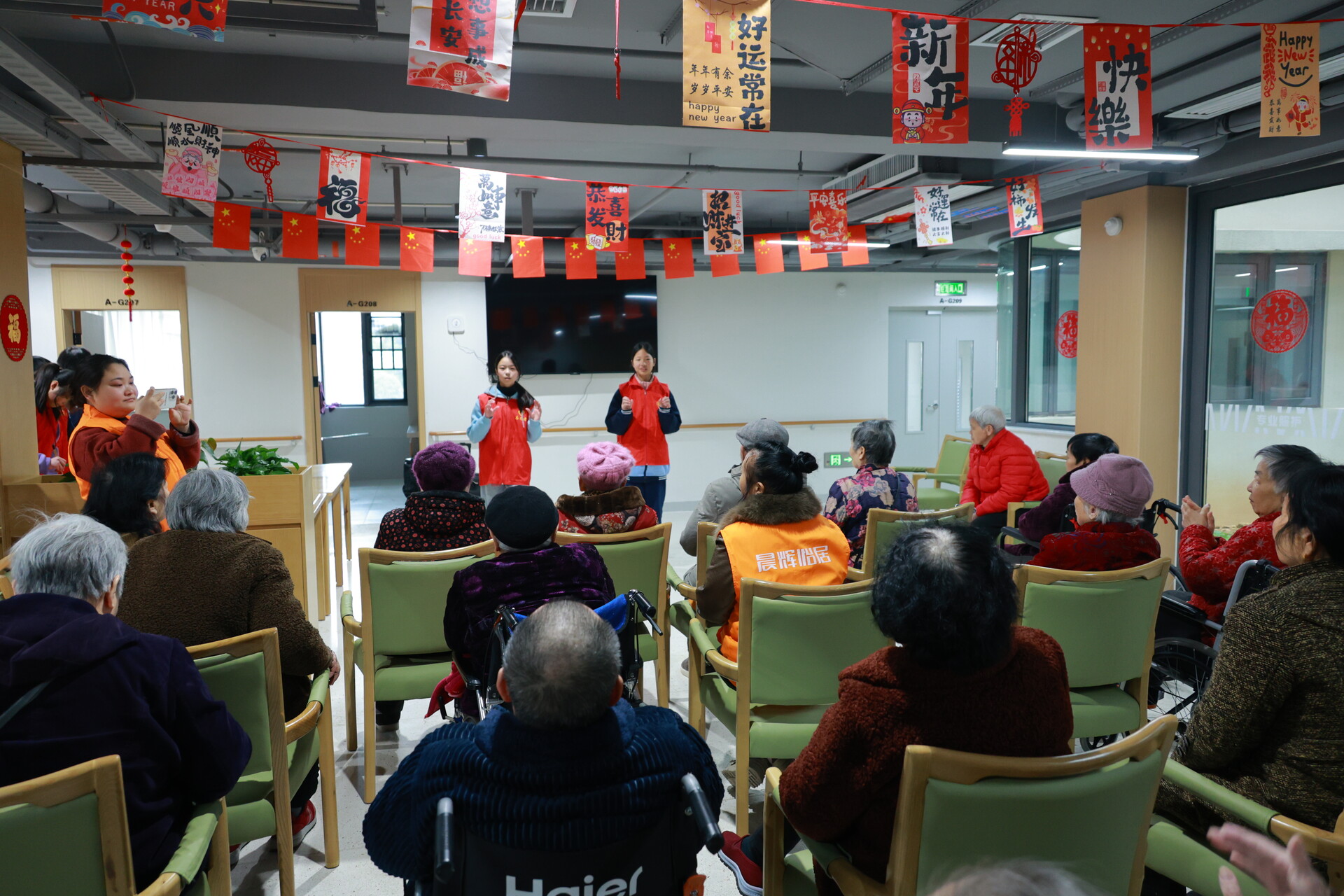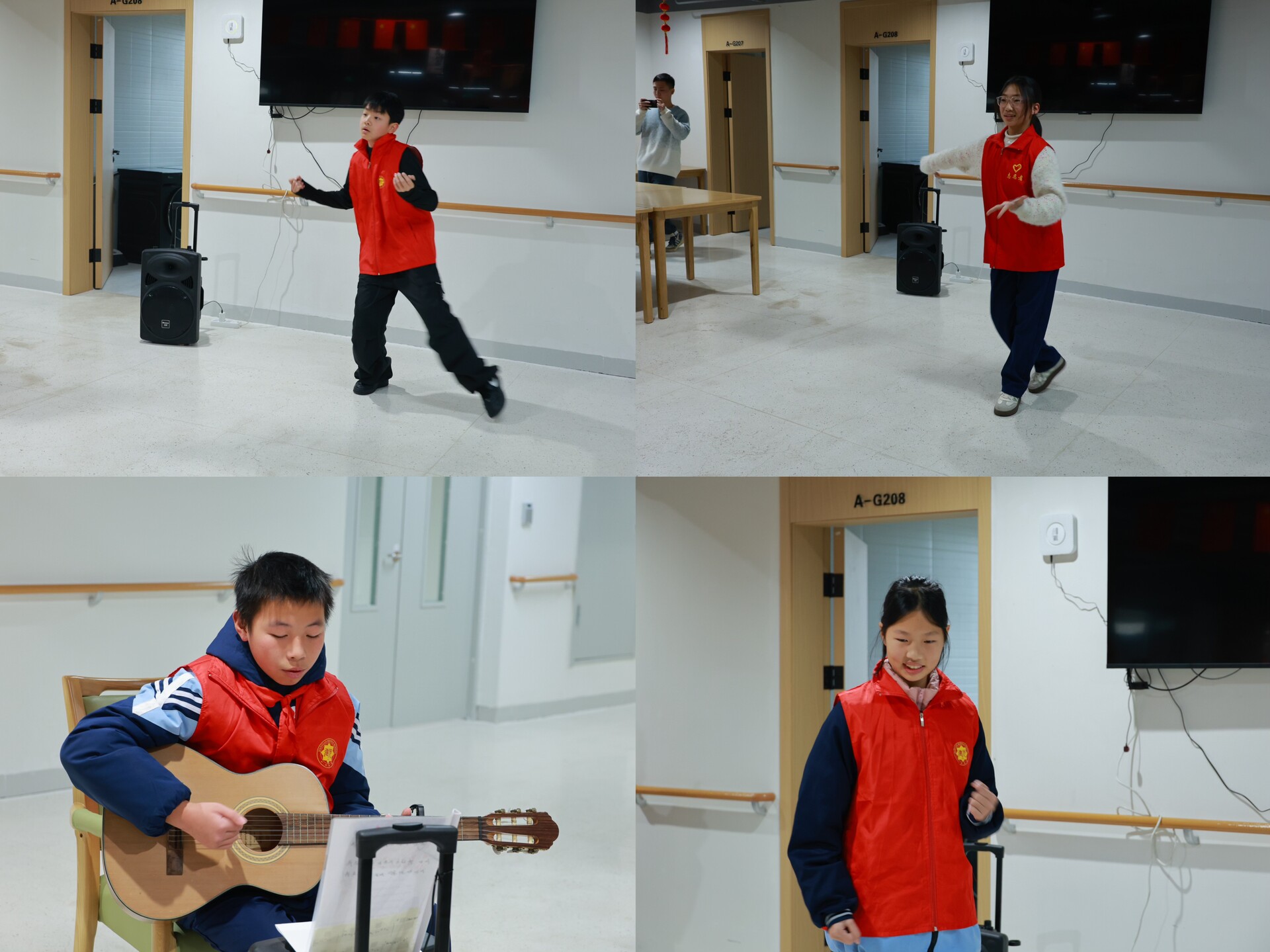 上午九点半,身着统一志愿服的孩子们在家委会家长的带领下抵达晨辉怡居养老院,主动问候老人、搀扶行动不便者就座,并送上牛奶水果等慰问品。文艺表演在老人们的掌声中拉开帷幕,没有华丽的舞台布景,却有着最动人的真情流露。志愿者各展所长,文艺表演随即展开。独舞、双人舞、吉他弹唱、合唱等节目轮番上演,熟悉的旋律与灵动的演绎赢得老人们阵阵喝彩,现场欢声笑语不断。书法爱好志愿者还现场为老人们写春联、送福字。