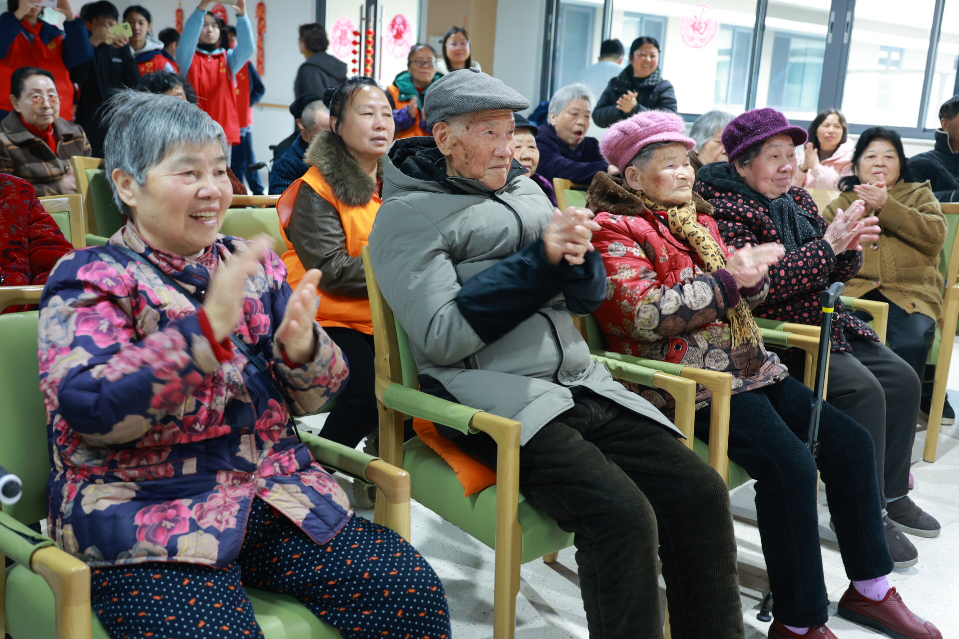 表演间隙,志愿者围坐在老人身边,化身“贴心陪伴者”。大家耐心倾听老人们讲述过往岁月的故事,分享校园里的趣事;有的为老人捶背揉肩,有的用手机为老人拍摄照片,定格此刻的温馨瞬间。“奶奶,祝您马年身体健康,笑口常开!”“爷爷,这是我们亲手写的春联,祝您新春吉祥!”一句句真挚的祝福,一声声暖心的问候,让养老院充满了亲情般的温暖。