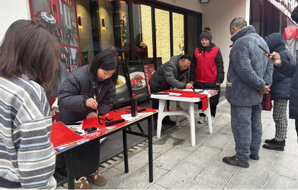 在现场,便民服务区同样热闹非凡。“爱心义剪”摊位前,三位志愿者理发师细心为老人、孩子免费理发。翰墨飘香的“写春联”区域聚集了不少书法爱好者,社区书法爱好者们挥毫泼墨,一幅幅寓意吉祥的春联和“福”字跃然纸上。居民们一边欣赏书法技艺,一边挑选心仪的春联,将新春祝福带回家。