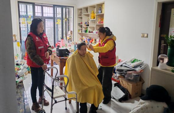 志愿者为独居老人理发。
