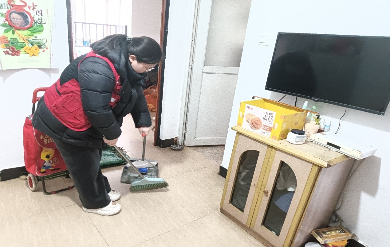 “跑小二”志愿者为独居老人认真清扫地面。