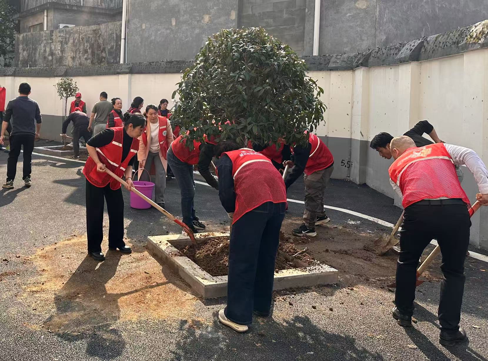 在植树现场,来自各单位的志愿者们及辖区居民群众热情高涨、干劲十足。大家身着红马甲,手持铁锹、水桶等工具,迅速投入到劳动中。一时间,铲土声、浇水声、欢笑声交织成一曲春日的劳动赞歌。大家充分发挥不怕脏、不怕累的精神,大家分工协作、配合默契——有的挥锹挖坑,动作利落;有的扶苗填土,小心翼翼;有的压实围堰,确保树苗稳稳扎根;有的提水浇灌,让清水滋润每一寸土壤。每一个环节都一丝不苟,每一道工序都认真细致。在众人的共同努力下,一棵棵新栽种的桂花树、红叶石楠在春风中昂然挺立,原本空旷的土地瞬间焕发出勃勃生机,嫩绿的枝叶在阳光下闪闪发光,仿佛在诉说着春天的希望。