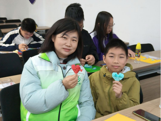新的学期承载了新的希望,开班仪式结束后,志愿者团队精心策划并开展了系列主题实践活动,助力青少年在实践中提升素养、感悟温情。活动期间,志愿者围绕巾帼雷锋式榜样事迹展开分享,详细讲述女性榜样践行使命、服务群众、勇于担当的先进事迹,引导青少年传承雷锋精神,厚植对巾帼力量的崇敬之情。随后,志愿者组织青少年开展爱心贺卡手工制作活动,孩子们以笔墨传情,将对女性长辈的感恩之意融入作品之中。最后的趣味数学手工环节,在志愿者的专业指导下,青少年通过计算贺卡制作材料尺寸、设计对称图形等实践操作,在动手过程中深化数学知识应用,实现动手能力与学科素养的双向提升。
