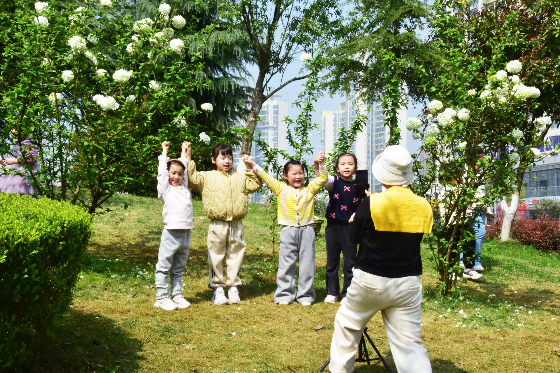 小朋友们趁着好天气游玩拍照。