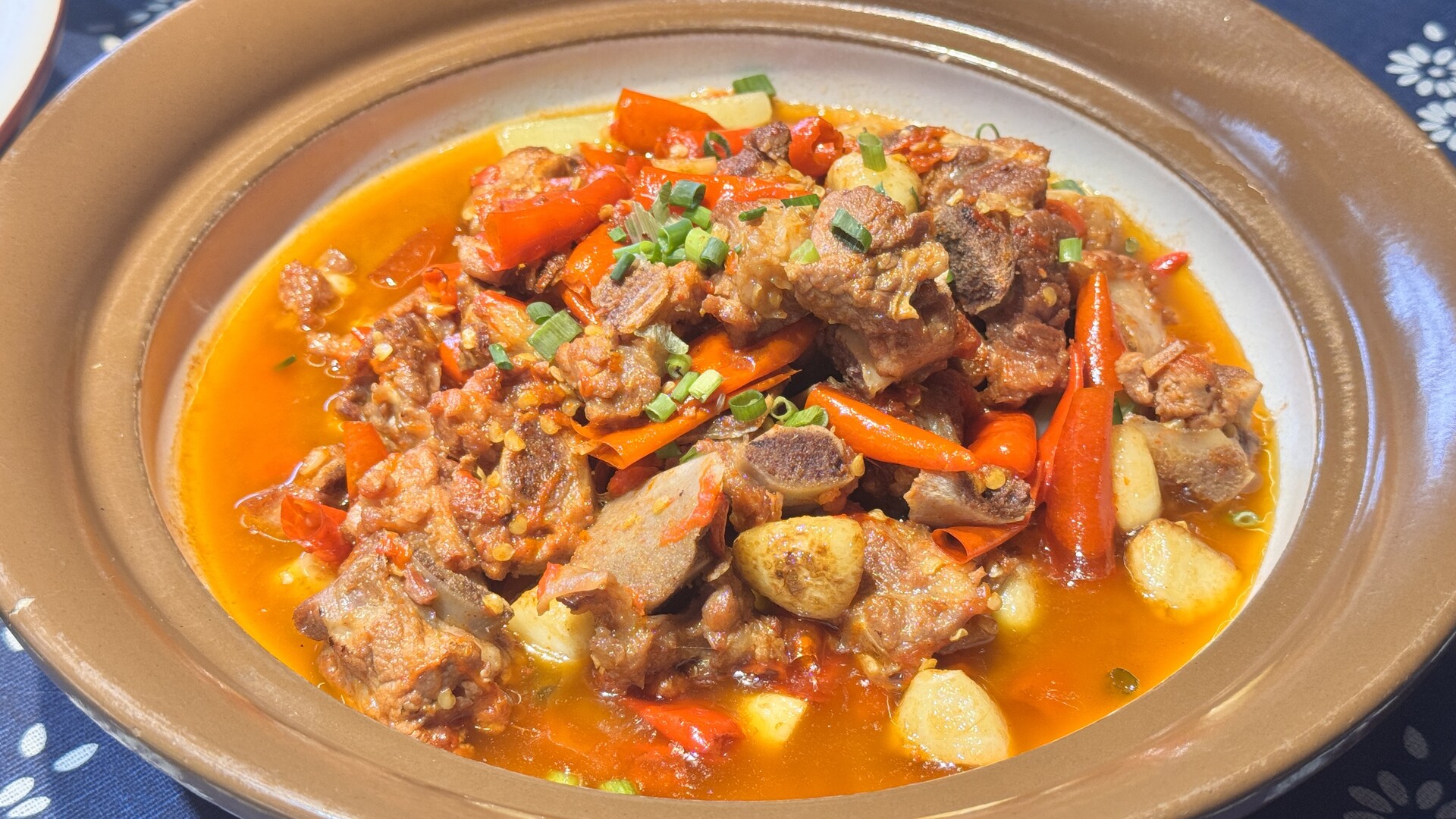 招牌菜带汁黄牛肉端上桌,一盆牛肉堆得实实在在,芋头打底,鲜香的辣椒段铺了厚厚一层,蒜末姜片都煸透了,香味直往鼻子里冲。夹一筷子入口,先是猛烈的香辣,紧接着肉香顶上来,嚼劲足,越嚼越有味。咸香里带着湖南辣椒特有的香气。牛肉片在酱汁里滚过一道,表面亮汪汪的,嚼起来嫩滑不柴。老食客的吃法是拿勺子舀汤汁浇在白米饭上,酱色汁水渗进米粒间,再把牛肉片盖上去,一口饭一口肉,几筷子下去,多吃两碗不成问题。