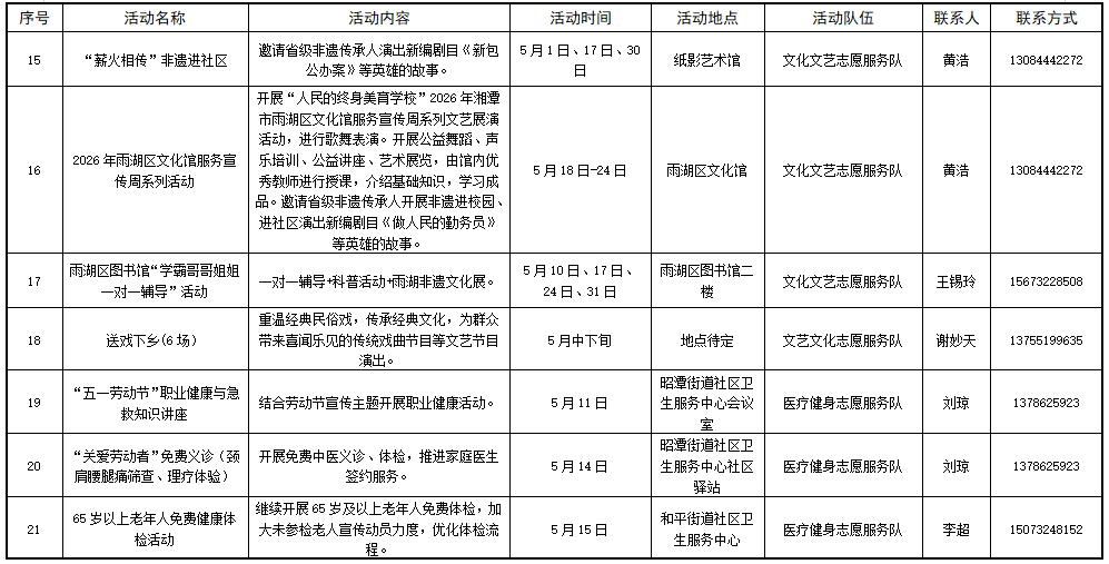 为倡导时代新风正气,弘扬中华传统美德,传播志愿服务理念,雨湖区新时代文明实践中心组织各专业志愿服务队、各新时代文明实践所(站),因地制宜开展群众喜闻乐见的文明实践活动,切实提高我区居民群众的思想觉悟、道德水准、文明素养、法治观念,更好地推动居民群众全面发展、全面进步。现将雨湖区新时代文明实践中心(所、站)5月新时代文明实践志愿服务活动安排公示如下:
