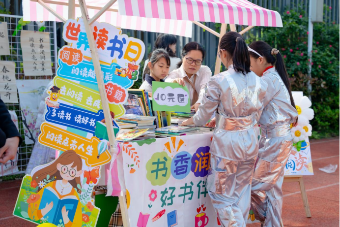 活动当天,校园莲行道氛围感十足,沉浸式阅读游园会率先火热开启。现场精心打造多元特色互动区域,热闹非凡、暖意融融。作品展区内,学生原创诗集、创意手抄报、硬笔书法佳作整齐陈列,一件件饱含心意的作品,笔墨藏初心、字迹见成长,生动展现了孩子们日积月累的阅读沉淀与扎实的文化素养。创意书铺街区人气满满,旧书置换、平价淘书活动有序开展,让好书循环流转、书香接力传递,特色科技主题书摊更是备受青睐,吸引孩子们驻足挑选,在阅读中走近科学、探索新知。一旁的猜谜兑奖区趣味十足,各类字谜、画谜、故事谜等趣味盎然,孩子们踊跃参与、动脑闯关,小小书签奖品,承载着满满的阅读喜悦。师生们还沉浸式化身经典书中人物,游走校园书境,让静态阅读鲜活起来,让书本故事走进现实,沉浸式感受阅读的别样魅力。此次游园活动也成为育人研修鲜活课堂,前来交流的教育同仁实地观摩、记录经验,细致借鉴学校阅读与科技融合育人的实践做法。
